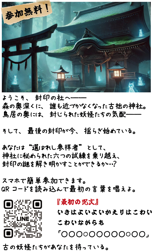 怪モノ神社の会場を舞台にした体験型謎解きゲーム「妖ノ社~あやかしのやしろ~」も開催いたします。